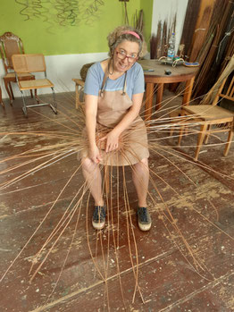 Wir arbeiten mit dem traditionellen Material, der Rattanschiene (Stuhlflechtrohr)